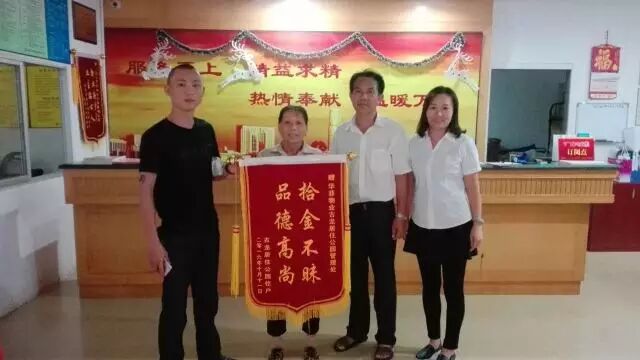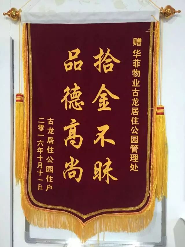 华菲物业古龙居住公园服务处的保洁员林清连在2016年10月8日约9点30分左右工作时,在14号梯垃圾桶旁清理垃圾时,发现一个白色塑料袋装了东西,捡起来打开一看,竟然是一大捆现金。她的第一反应:肯定是住户错当成垃圾扔了。对于一个月薪不到贰千元的保洁员来说,那可是一笔巨款,当时她的心脏扑扑直跳,但很快转念想到,等住户反应过来将钱当垃圾扔了不知有多着急啊!于是她当即用保洁用的塑料桶装起来,站在垃圾桶旁等待失主。大约过了半个时辰只见一位年轻人(14梯某单元租户黄先生)急急走到垃圾桶前,问林大姐有没有捡到钱,林大姐告知失主,她正等着失主来领呢!黄先生当面清点了5万元现金,分文未少。为了表达对林大姐的感谢,黄先生特地送来一面锦旗。服务中心将林清连这种拾金不昧的行为通过微信平台在项目工作群和业主群进行了宣传,小区业主为华菲物业有这样高素质的保洁员称赞不绝。林清连这种高尚的品德不仅为华菲物业,更为所有从事在一线工作的物业基层员工的赢得了尊重!